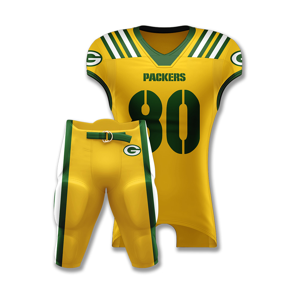 An American football uniform is a layered system of protective gear and team apparel, featuring a helmet with facemask, a jersey (often tight-fitting with large numbers), padded pants with integrated hip/thigh/tailbone pads, cleats, and socks, plus additional internal pads (shoulder, rib, elbow) and a mouthguard for comprehensive safety during high-impact plays.